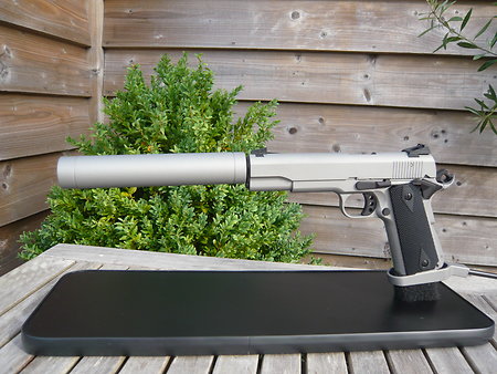 A special edition gsg 1911 long barrel pistol .22 full titanium edition by julian at TPR . This pistol has been fully stripped down and every part of this pistol has been sprayed in cerakote in titanium and graphite black and fitted with our custom black ops grips. This pistol is brand new with all paper work